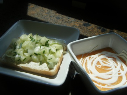 Feel like you’ve spent your entire life in the customer service line? Tired of being fed the robotic, ubiquitous and industrial tomato soup with grilled processed cheese? Then give today’s lunch menu a go with someone you love. This light and tasty combo is vegetarian friendly and takes advantage of two peak late-summer crops. Its slightly adventurous and playful, but won’t alienate lovers of the S&S tradition. C’mon, Robots need love too…