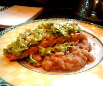 To serve, place a generous spoon of the bean and potato mixture on a warmed plate, top with the salmon filet and spoon over some of that lovely leek sauce.