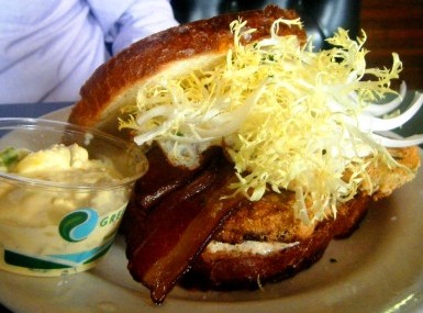 Hades ordered the Fried Green Tomato BLT, topped with a fried yard egg, a pretty ruffle of frisee and oo-wee sauce. Let me tell you: oo-wee, it’s good sauce and a good sandwich. I think fried green tomatoes can be kind of pain to do right. And Chef Caskey does them right. Nice, thick, meaty tomato (you can easily screw them up and make them mushy, not so here), along with thick, meaty bacon made a wonderful fare-the-well to summer sandwich.