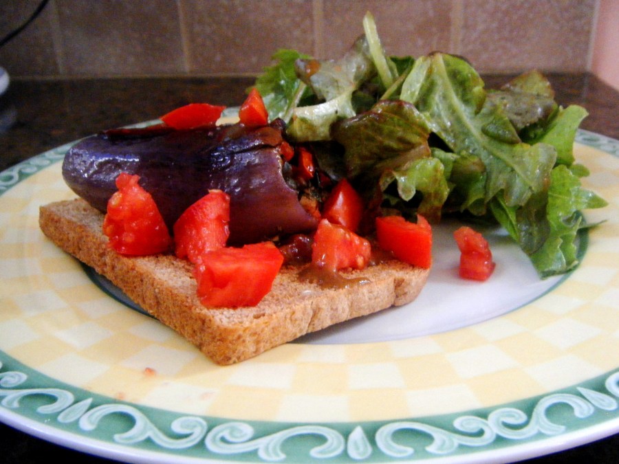 Toast the bread slices.  When done, give each slice of toast a quick rub with the garlic clove (toast acts as a nice grater).  Mix the dressing with two to three tablespoons oil to one tablespoon of vinegar, whisk in a teaspoon of vinegar, a heaping teaspoon of cumin, and a drizzle of local honey.  Salt and pepper to taste.  Dress the greens.