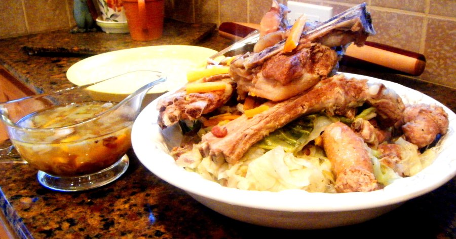 In a large roasting pan (because it’s just that big of a meal) placed over two burners, crisp the bacon ends. Then add the leeks, and soften over medium heat. Season and sear the trotter, over medium high heat. Add the stock and let it reduce for five to ten minutes. Add the ribs, and the water. Bring to a boil, add the carrots. Reduce to a simmer. Cook for about 30 minutes. Add the cabbage and the sausage. Cook for another 30 minutes.