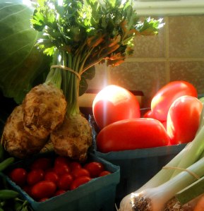 Last night, I made a pappa al pomodoro with Roma tomatoes from Wishwell Farm and the leftover ciabatta from Omega in North Market. I also used carrots and a celeriac that I picked up on Friday at the Pearl Alley Farmers Market. All this local produce simply prepared made for a lovely meal. The soup is a thick one, almost like a porridge. We served it fairly warm, but I can see making this mid-summer and placing it in a cool pantry before serving it.