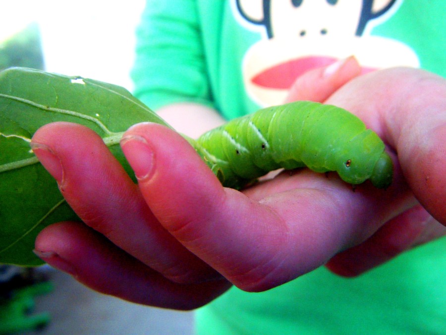 In putting all the garden to bed for the fall, we pulled up the last of the tomato and pepper plants. We found this “little” guy on one of the pepper plants. He had pretty much cleaned off most all the leaves. Cherub was fascinated and who could blame her. It reminded us of the caterpillar in Alice in Wonderland. This is either a tobacco hornworm or a tomato hornworm. I’m leaning toward a tobacco hornworm. But whatever it is, it doesn’t sting or bite. We tossed it in the compost with the rest of pulled up pepper plants after our photo shoot.