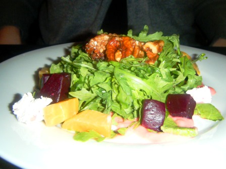 Next was a beet salad (I love beets, I can’t wait to share a really good recipe I have with you). Pretty arugula, red and golden beets, candied walnut and a great dressing made for a fresh interlude between heavier courses. What heavier courses you ask?