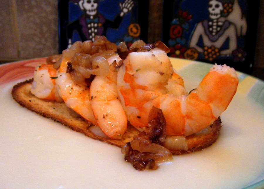 In a warm, shallow, wide bowl, ladle in the soup. Float a piece of the toast in the center, top with the shrimp and a bit of the shallots.