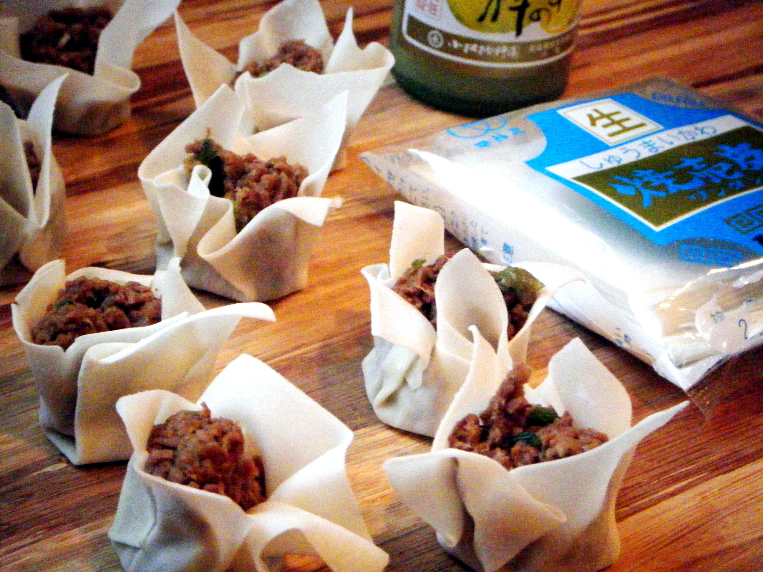 To assemble: take 1 shumai wrapper and place one teaspoon of the brisket filling in the middle. gather up the edges to wrap around the filling to make a sort of open topped purse. Cute.