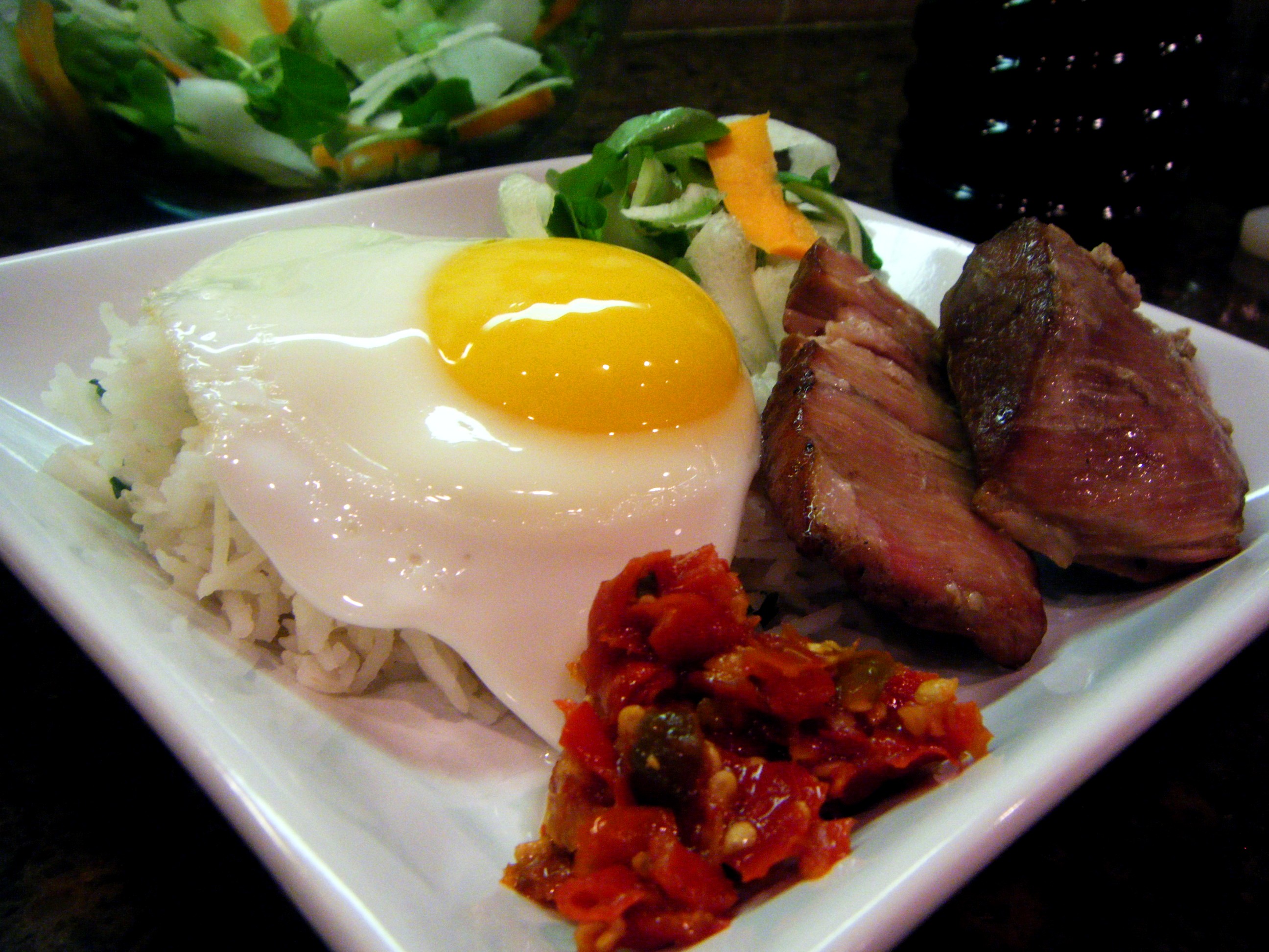 While the belly is braising, make your salad, and prepare about 1 cup of rice, stirring in some fresh chopped coriander when its done. Finally, make your sunny-side up eggs.