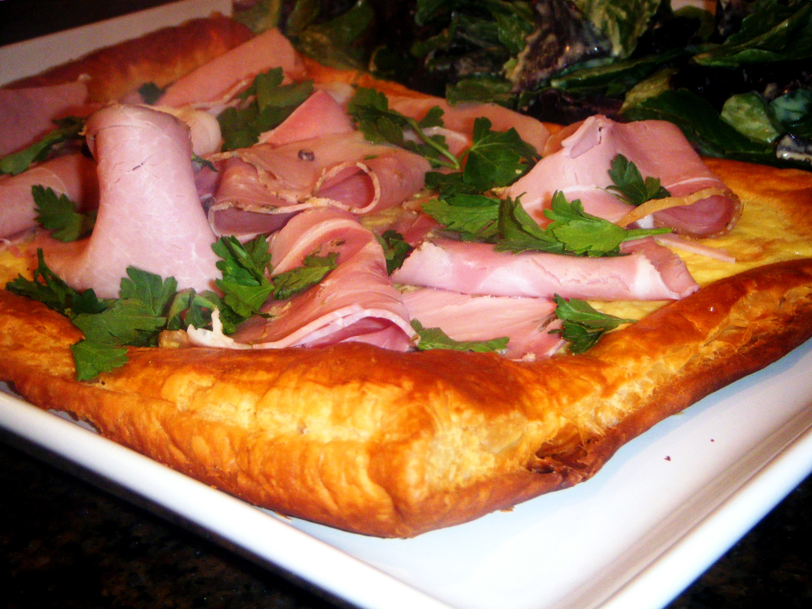 When it’s done, carefully remove the tart to a serving platter or large cutting board. Pile the ham artfully across the top and sprinkle with the parsley.
