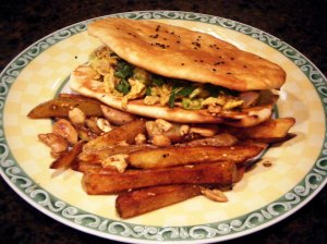 Sometimes it’s nice to have a sandwich for dinner. There’s a feeling of simplicity to it. There’s an even greater feeling of ease to if, if you’re using leftovers to start. I had some of the white ginger chicken leftover that was already deliciously flavored. Why not work that into an Indian spiced chicken salad, make a few fries and call it a night?