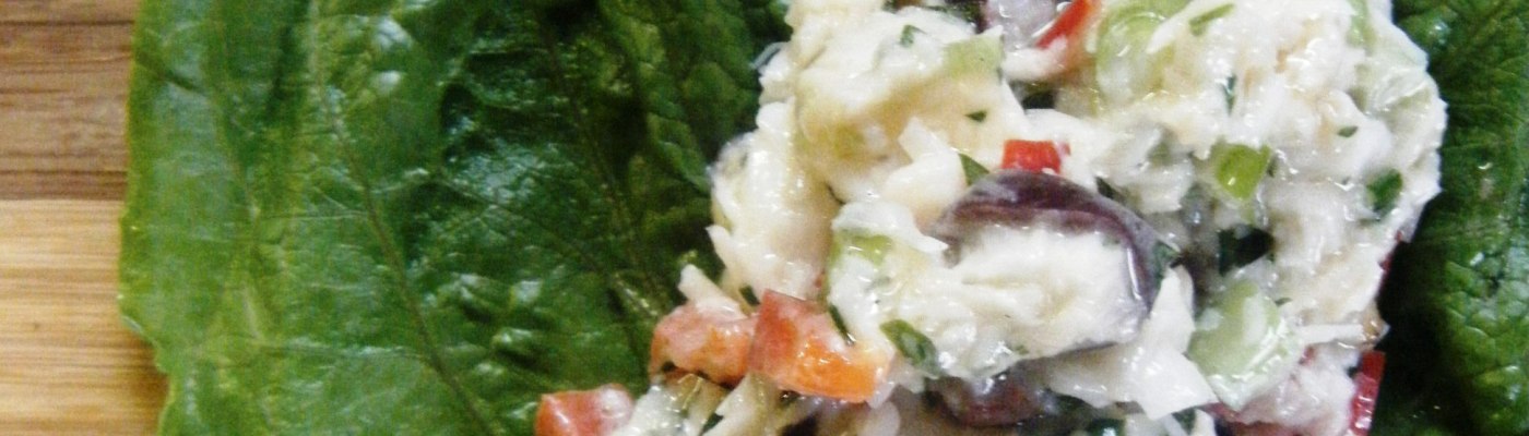 And after its warm bath, the fish easily gave up all those bones just with a bit of light flaking into a bowl. This salad is wonderful in its traditional forms: on a croissant (from Pistacia Vera?), over a salad of spring greens, on toast (from Omega Bakery?) or, as I did, in lettuce leaves that rolled up into little roulades. Add in a few strong, non-traditional ingredients (olives, capers, a brunoise of red bell pepper) and you’ve got something that a lady who lunches or a fish phobic person (I’m not fish phobic, I’m bone phobic) will really enjoy.