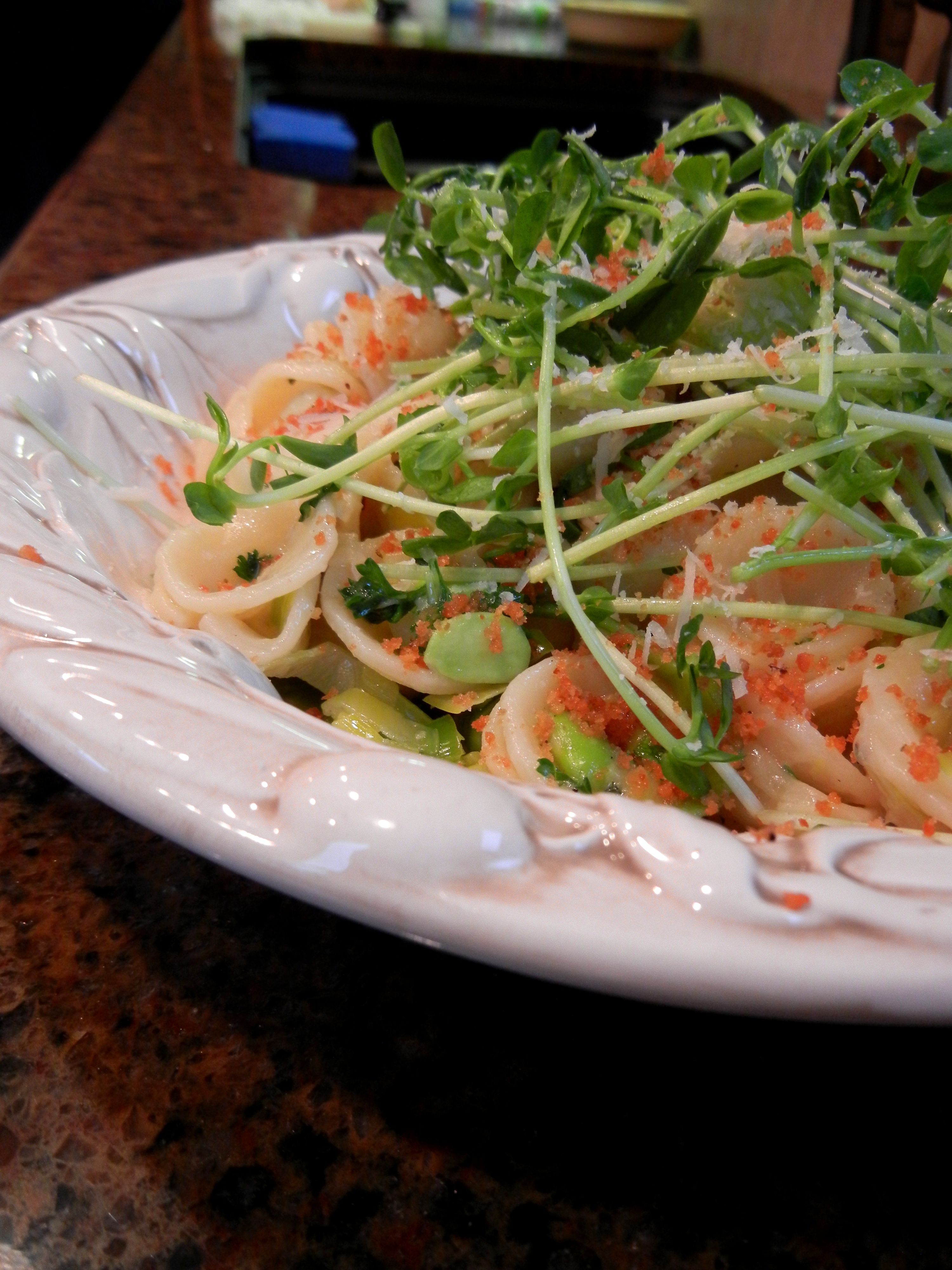 It’s been so rainy today that everything in sight is a variation of green: the yet-to-be-mowed grass.  The budding trees.  The trembling stalks supporting the heavy heads of daffodils.  My dinner of orecchiette bathed in butter, chartreuse leeks, backyard mint and verdant parsley.  Tiny pasta ears cradle pale green edamame, the whole bowl crowned with pea shoots.  It was as close to a taste of spring in a bowl as I’ve come in a long time.  It is long overdue.
