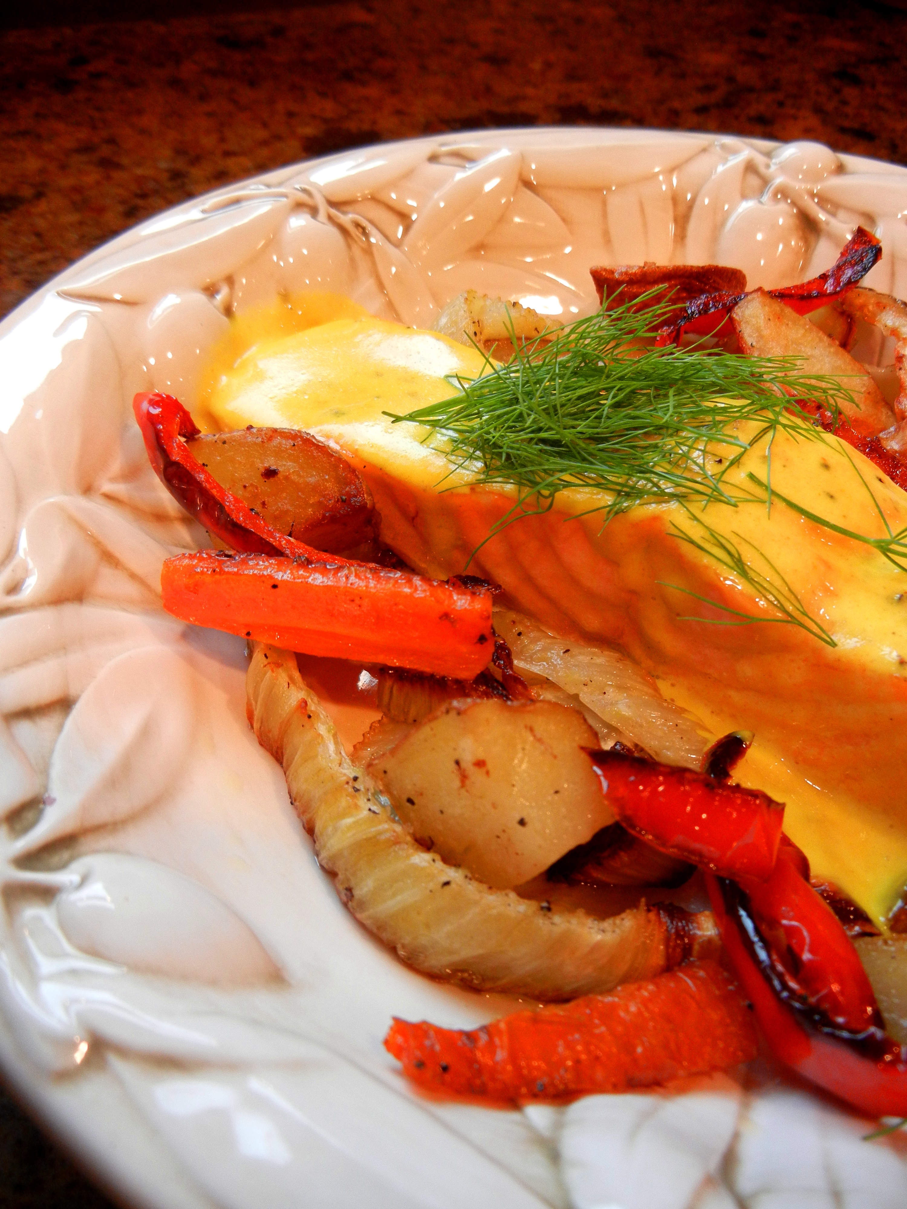 To serve, plate the salmon and surround with the raosted vegetables. Pour a drizzle of the saffron tumeric cream over the salmon. (More over the vegetables if you want to bathe in it, like Cherub and I did.) Top with a few strands of the fennel fronds.