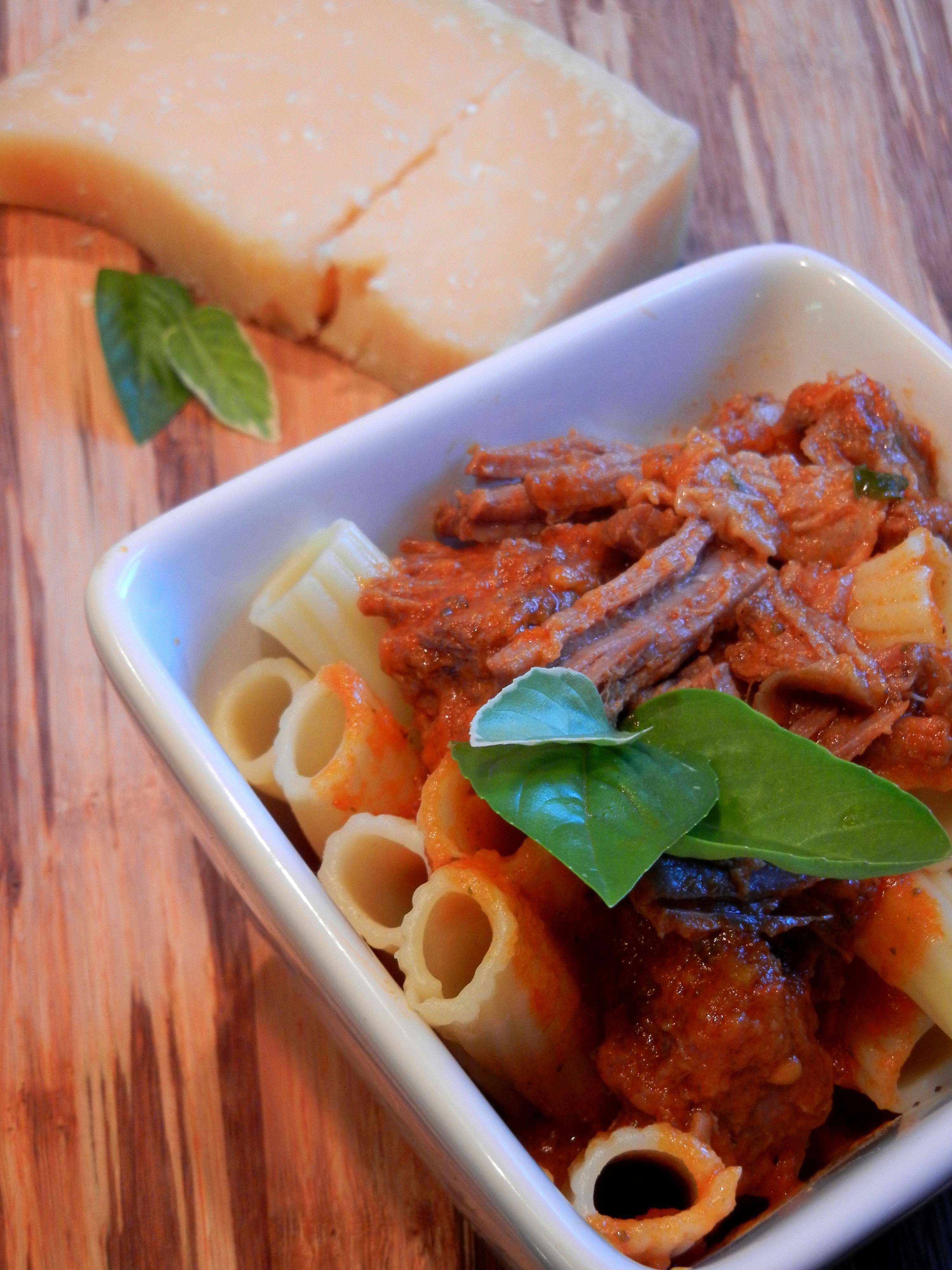But if you’d like, add in those short ribs that you’ve seasoned with salt and pepper. Oh yes, I know, we haven’t browned them. Do you want to? Do you have time? Fine. Feel free. Otherwise, just slide them in the tomato sauce and cook over very low heat for at least two and half hours on the back burner of your stove. Ignore it until dinner. Did you start this process at noon? Fantastic. Eat it at 6. A braise is a beautiful thing. Cook for as long as you have time, over low heat, stirring only occasionally. As in, “I feel a nap coming on. I’ll stir it when I get up.”