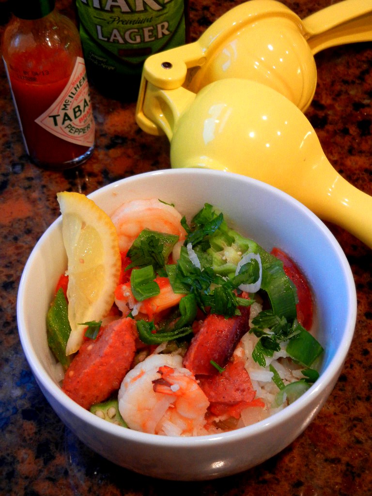 I was so happy to see that he was featured in September’s Southern Living and that he gave up some great recipes. I made his Lowcountry Shrimp-and-Okra Pilau for dinner tonight. Fabulousness in a bowl, really. Plus, Cherub’s first experience with okra was a successful one thanks to this recipe. I used some local Schmidt’s Bahama Mama smoked sausage as well as the okra I picked up at the Worthington Farmer’s Market. Don’t be afraid. Okra is delicious, even when unadorned and not fried.