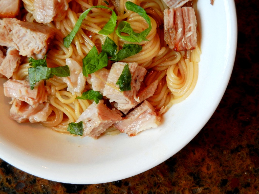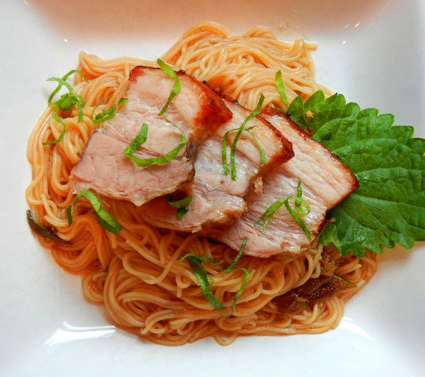 To serve, slice the pork belly and toss the somen with some of the braising liquid and whatever stir-fried vegetables strike your fancy (green peppers, carrots, daikon, thinly sliced beet greens, bean sprouts, a poached egg, whatever tastes good to you).  Drizzle with some high-quality soy sauce and garnish with sliced fresh shiso leaves.