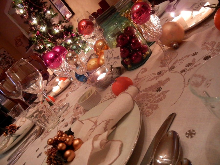 Linens from great grandma, dishes from an aunt and uncle, glassware from mother-in-law, antique ornaments from Grandmother, antique ball jars from a Twitter friend, food from our kitchen. (Plus cute clementine place card holders for whimsy.) I love a meaningful table.