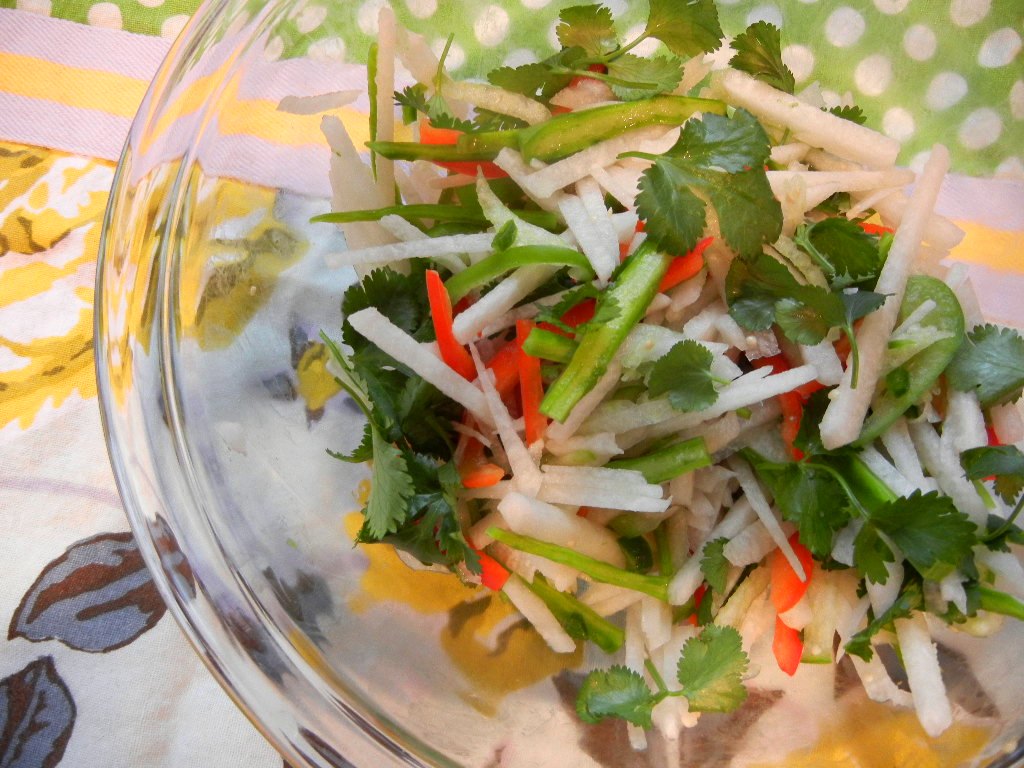 This quick cold salad is tasty enough on its own for lunch, but is fantastic on some of that pork. You can sub some radishes and apples (add lovely sweetness) for the cactus or jicama, if you have trouble finding them. But the cactus is so full of gorgeous green flavor, and the jicama so sweet and crunchy, do make an effort to stop in a reputable Hispanic market with brisk turn over in its produce department to track some down to try. Next time I make this, I might also toss in a green onion thinly sliced and perhaps some pomegranate arils for extra crunch.