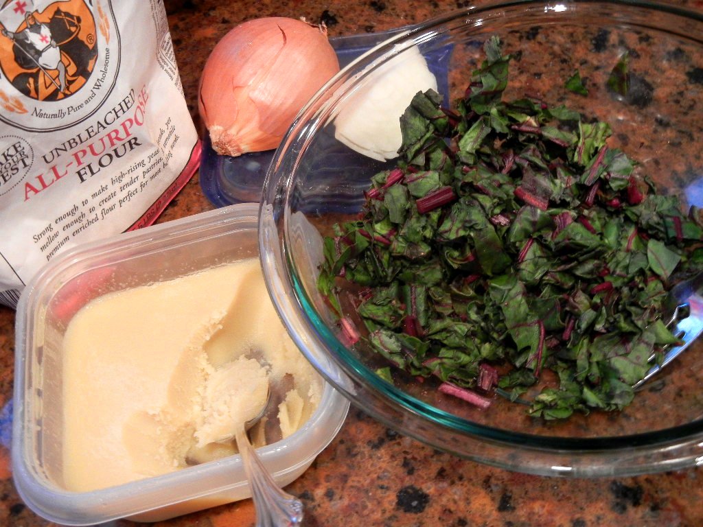 Beet Greens with Duck Fat and Onion Gravy, makes enough for two (but barely, if one of them is me)