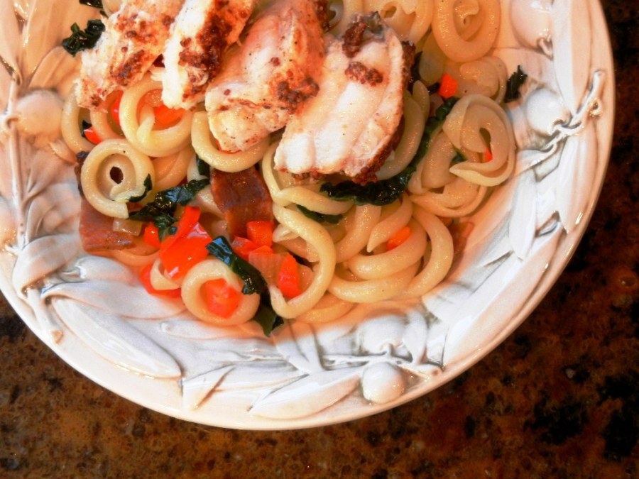 Begin with the sauce for the pasta. Slice the jowls very thickly (in about 2 inch pieces), and render over medium-low heat for about 15 minutes, or until crisped up like bacon. This will produce prodigious quantities of grease, and that is good. Pour off any excess and reserve 2 tablespoons. Keep the rest, since you never know when you’ll need pork cheek fat. Add the garlic, onion, tomatoes and red pepper flakes, and soften for 8 or so minutes. Finally, add the kale and turn the heat to low.