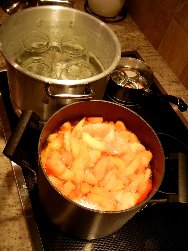 Although I think I’ll give the raw pack method a shot next time (this version left the peaches very cooked and soft), the beautiful thing about this recipe is the copious amounts of peach nectar that you are left with.  I jarred two extra quarts of nectar that I spiced in a couple of ways: one with generous amounts of tarragon and the other with peppercorns, clove and thyme.