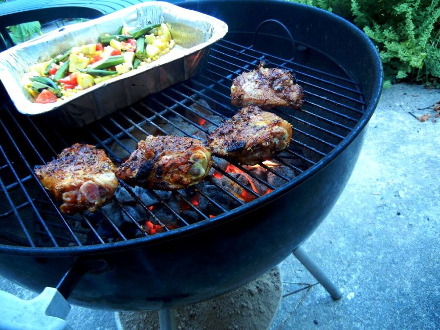 Enter this super-summery dinner that’s cooked entirely outside and takes no more than about 10 minutes to prep in the kitchen. Tonight’s easy meal was chicken thighs (bone in, skin on please) rubbed with this quick spice mixture and left to marinate, and a ton of peak-season summer produce and a ton of flavor. But the star is the okra.