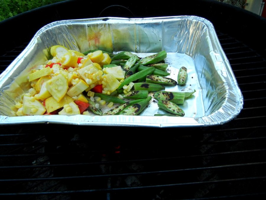 Combine all ingredients except the okra in a bowl. Heat either a cast iron skillet or a foil grill pan over the center of a grill until smoking hot. Add in the okra to the dry pan and allow to char on one side without stirring, about three to five minutes, depending on your pan and your fire. Now give the okra a stir, then add in the remaining ingredients and stir. Move the pan to the side of the grill for a more indirect heat and cook for another five to seven minutes, stirring frequently.