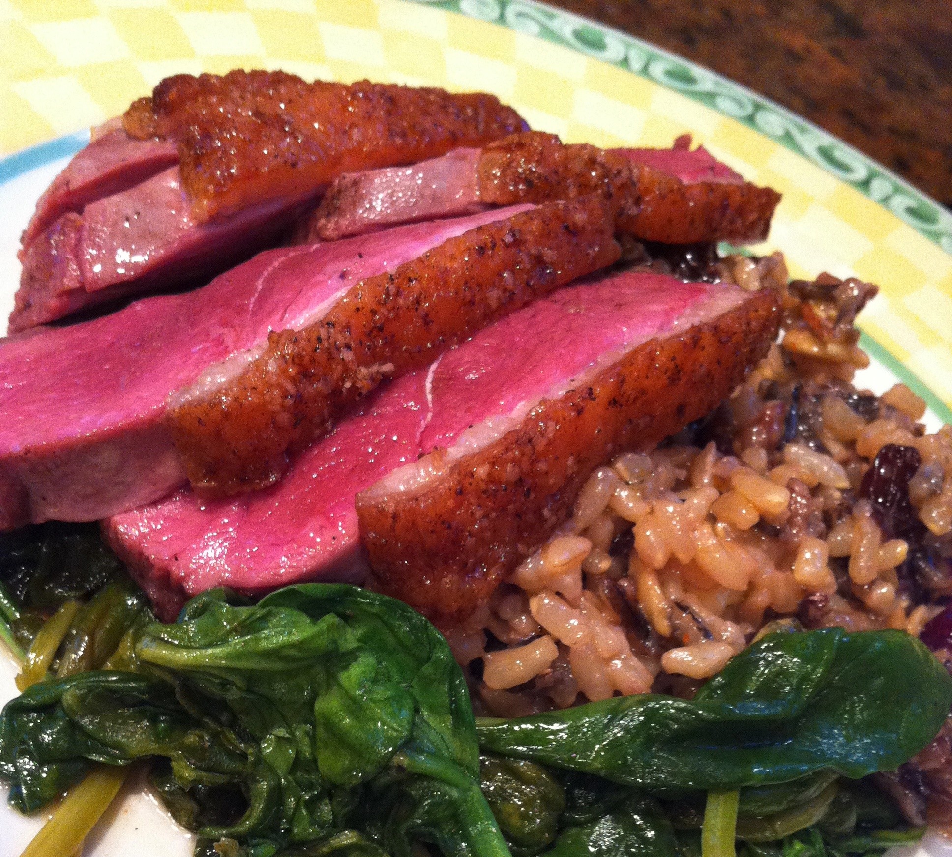 Distribute the spinach between two plates, mound some of the rice salad on top of each and layer the sliced duck breast on top.